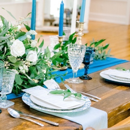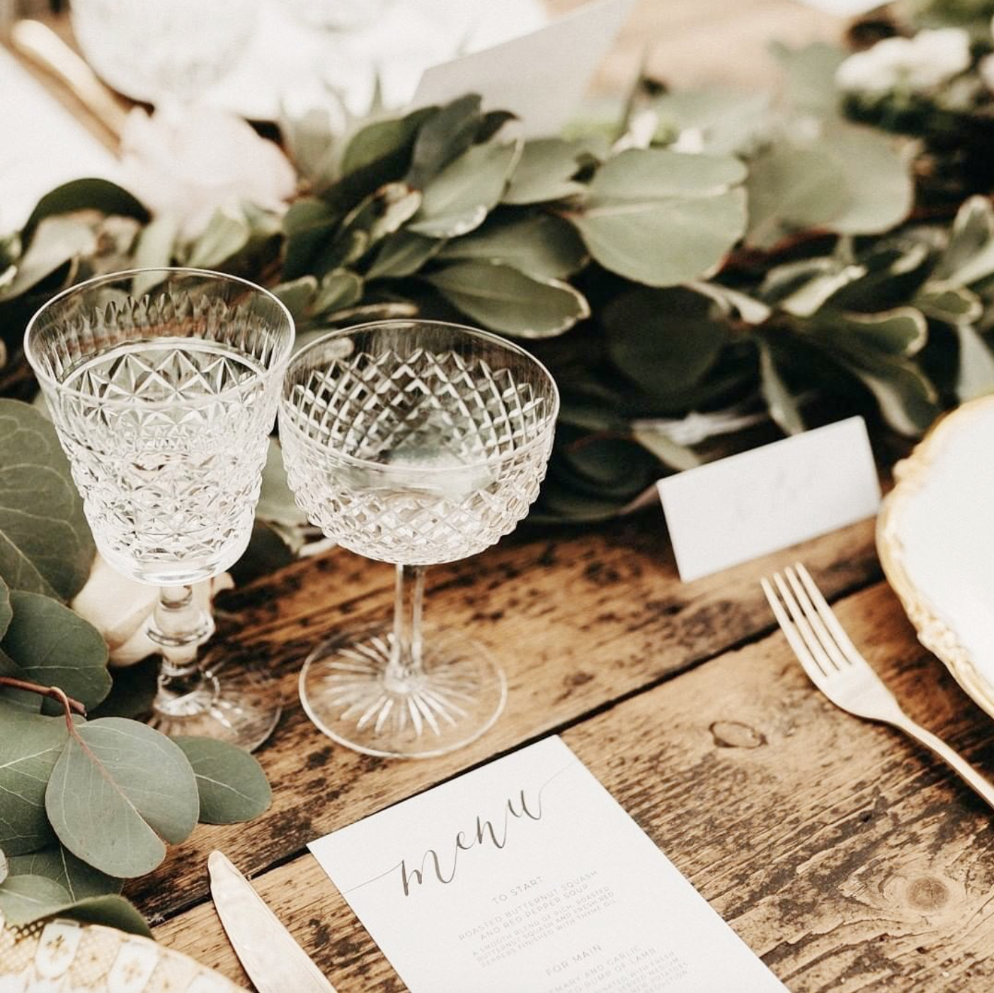 Vaisselle, couverts et verres distinctivement vintage pour une réception hors du temps.